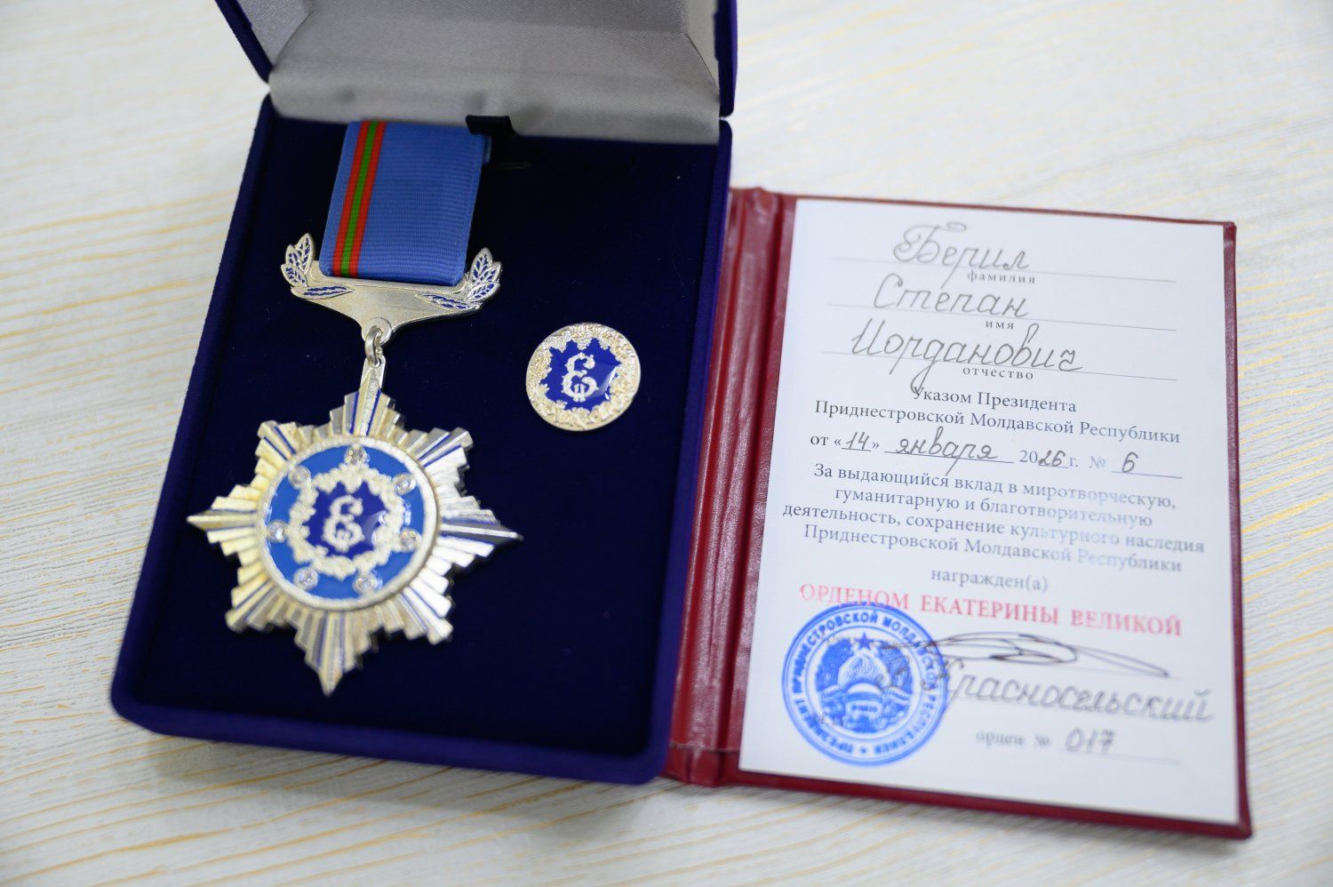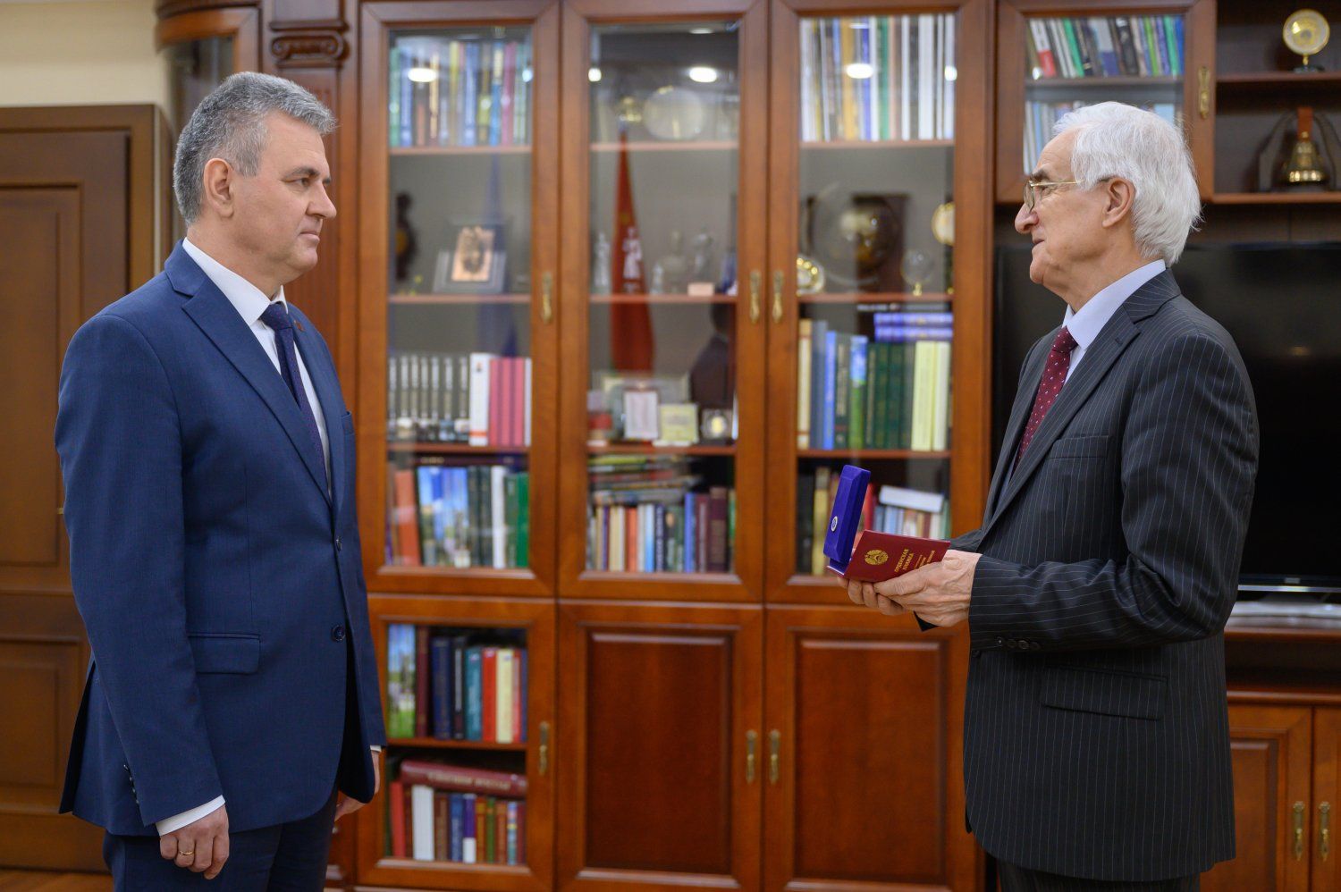 The working discussion was preceded by an awards ceremony. The State General Education Institution "Taras Shevchenko Pridnestrovian State University" president, Doctor of Physics and Mathematics, Professor Stepan Beril was awarded the Order of Catherine the Great by the presidential decree. This award is presented for outstanding contributions to peacekeeping, humanitarian, and charitable activities, as well as the preservation of the cultural heritage of the Pridnestrovian Moldavian Republic. Vadim Krasnoselsky personally presented the order, thanking Stepan Beril for his many years of fruitful work and emphasizing that the award is not simply appreciation on the occasion of his 75th anniversary, but a well-deserved recognition of his achievements.